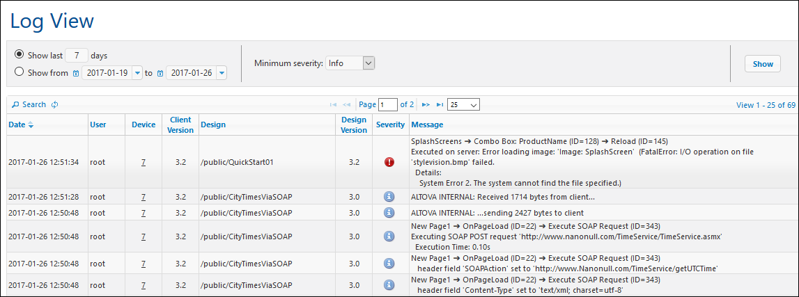 The Log tab shows the logged actions—including changes to server settings (who and when). Logs are shown according to the selected filters, which are located at the top of the tab (see screenshot below). If you wish to see all the logged actions (rather than only warnings and errors), go to the Settings | Logging tab and make sure that the Logging level detail is set to Info. The log columns relating to each design action show the following: the name of the user, the client device (identified by an ID, the associated details of which can be seen in the User Licenses tab), the version number of the MobileTogether Client app on the device, the version of MobileTogether Designer with which the design was created, and the severity of the message (Info, Warning, Error).