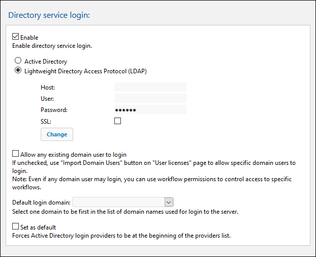 If Directory Service Login is enabled, users can log in to the server with their domain-specific user names and passwords (see screenshot below). After enabling Directory Service Login, you can choose whether to use Active Directory Login or Lightweight Directory Access Protocol (LDAP) for login via directory services. Active Directory login is used by Microsoft Active Directory. The LDAP option can be used with any other directory service provider that supports LDAP.