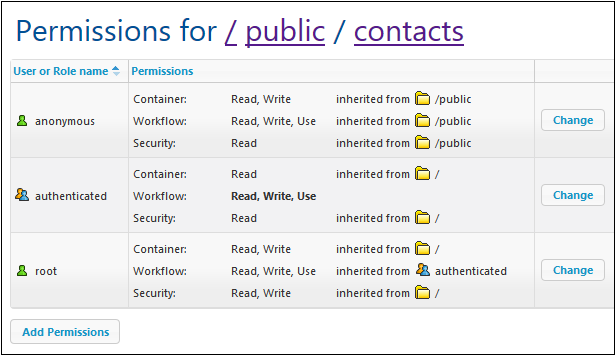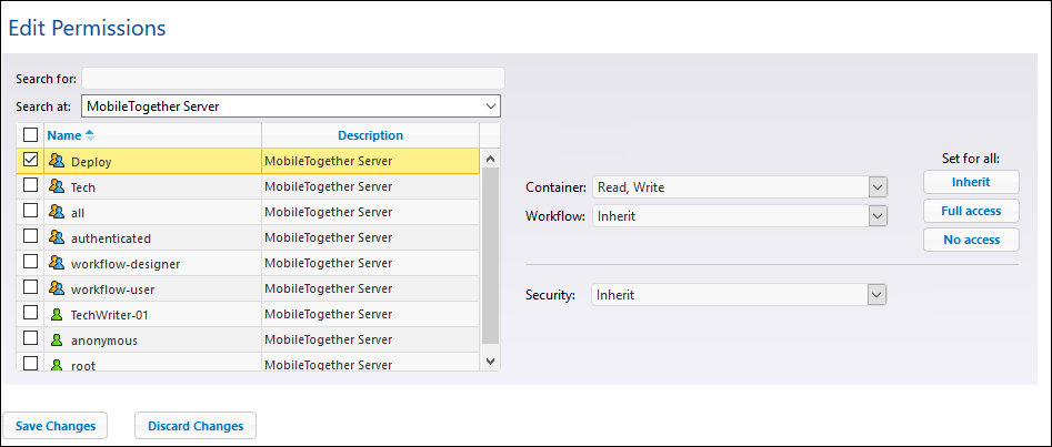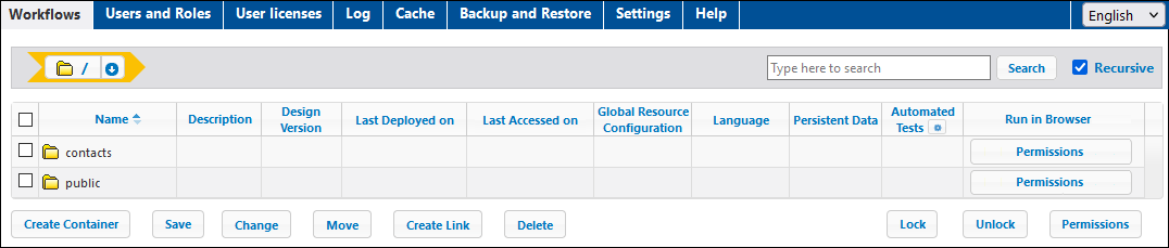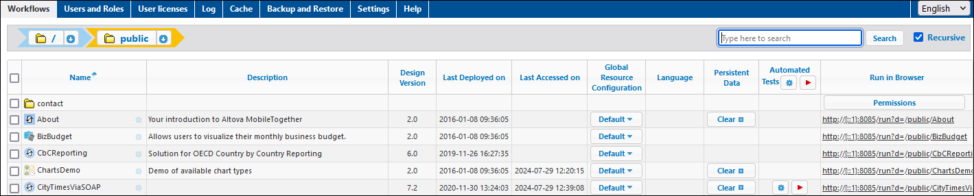 The Workflows tab (screenshot below, showing the Advanced edition) provides an interface for managing the container structure of the root folder of MobileTogether Server and the access rights (permissions) for each container. Containers are folders that contain sub-containers and/or solutions (also called design files or .mtd files). MTD files cannot be added to a container via the server's Web UI, but are deployed to the server from MobileTogether Designer. At deployment, the exact path to a container must be specified; this is facilitated by being able to browse, in MobileTogether Designer, to the required container.