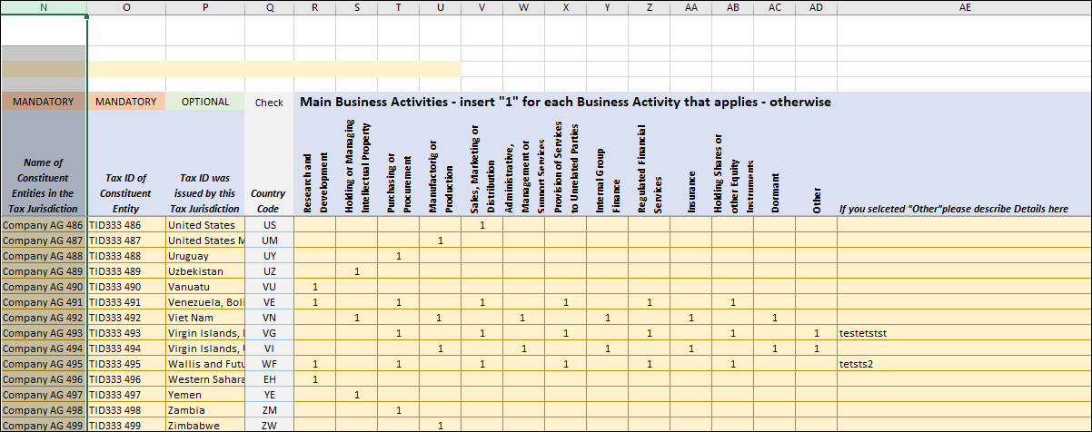 •Each business activity is assigned a column (R to AD). If a business activity applies to a given constituent entity, then enter 1 in that column. If the constituent entity is involved in some business activity other than those listed here, then enter 1 in the Other column, and, in the last column, enter details of those business activities.