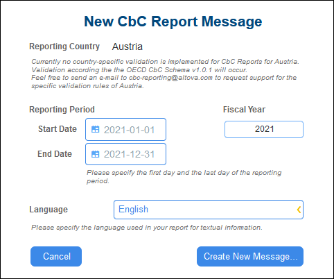 2.In the form that appears (screenshot below), select (i) the start date and end date of the period for which you want to create the report, and (ii) the language you want to use in your report. If the period is not a 12-month period, enter the length of the period in the Warning field of the report's Message Information tab.