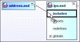 Once you have dragged a schema into a Design window, you can create includes, imports, and redefines by adding the referenced schemas to the design and using drag-and-drop. To this aim, each schema or .mfd file box has a handle located at the right border of the title bar.