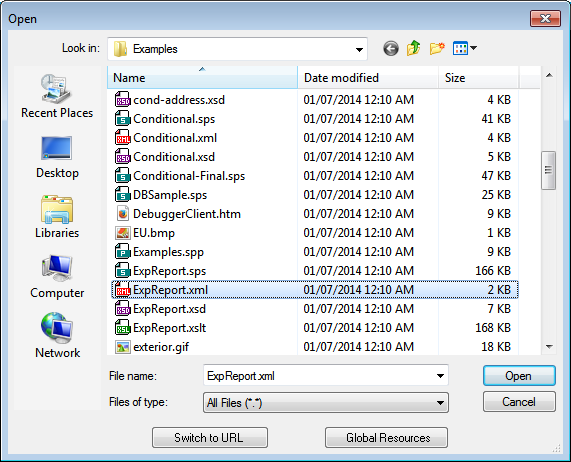 In several File Open and File Save dialogs, you can choose to select the required file or save a file via a URL or a global resource (see screenshot below). Click Switch to URL or Global Resource to go to one of these selection processes.