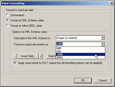 The Value Formatting that you define applies to Authentic View. Additionally, some Value Formatting definitions—not all—can also be applied to HTML output. To do this, check the Apply Same Format to XSLT Output check box. If this option is not checked or if it is not available, then only Authentic View will display the Value Formatting; the output will display the value in its lexical format (for nodes) or, in the case of Auto-Calculations, in the format to which the Auto-Calculation evaluates.