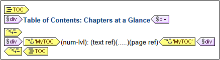 3.Creating the TOC template: This is the template that creates the TOC in the document. It is structured into level references (levelrefs), which must correspond to the structure of TOC levels in the design document. For example if there are three nested levelrefs in the TOC template, then the design document must have at least three nested levels. In this example we have a single levelref to correspond to the single TOC level in the design document. It is within the levelref that the TOC reference (TOCref) is placed. It is this TOCref that generates the TOC items for this level in the TOC.