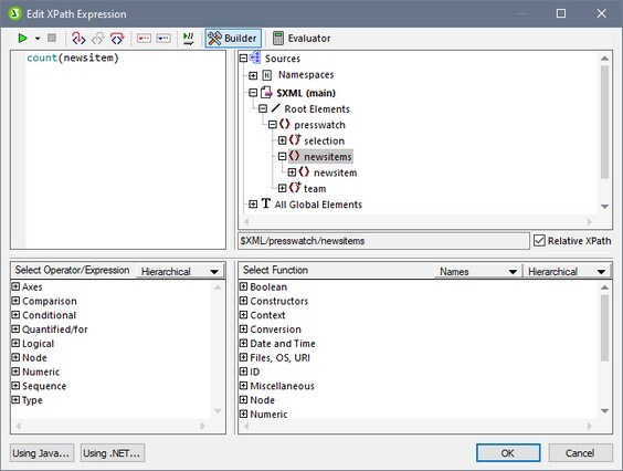 When the Builder button in the Edit XPath Expression dialog is clicked (see screenshot below), entry helper panes to help you build an XPath expression become visible. Double-click an entry in any of these entry helpers to enter it at the current cursor point in the XPath expression.