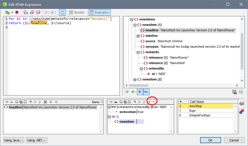 Variables that have been declared in the expression and that are in scope in the current evaluation step will be displayed together with their respective current values. For example, in the screenshot above, processing has been paused at the breakpoint on headline. The $i variable is in scope at this evaluation step. So $i is displayed with its current value, which in the screenshot above is the first newsitem node.
