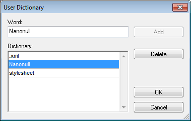 To add a word to the user dictionary, enter the word in the Word text box and click Add. The word will be added to the alphabetical list in the Dictionary pane. To delete a word from the dictionary, select the word in the Dictionary pane and click Delete. The word will be deleted from the Dictionary pane. When you have finished editing the User Dictionary dialog, click OK for the changes to be saved to the user dictionary.
