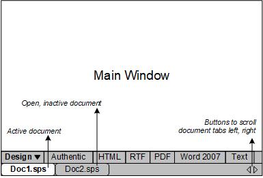 •Multiple SPS documents can be open in StyleVision, though only one can be active at any time. The names of all open documents are shown in tabs at the bottom of the Main Window, with the tab of the active document being highlighted.