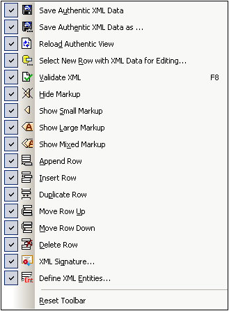 The Authentic toolbar contains commands for customizing Authentic View and editing XML documents in Authentic View. These commands are shown in the screenshot below (the customization menu for adding and removing Authentic toolbar buttons, available when you click the Customize button at the right of the toolbar).