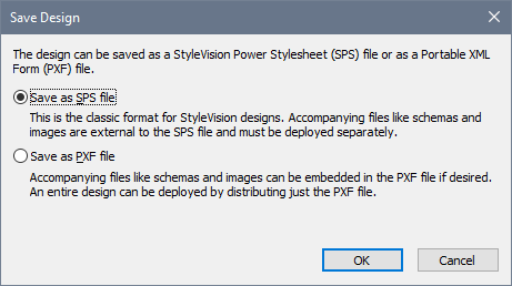 The Save As command enables the design to be saved: (i) as an SPS file or (ii) as a PXF file (Portable XML Form file). Clicking the command pops up the Save Design dialog (screenshot below). Select the required format and click OK.