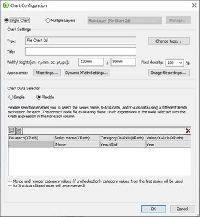 If you wish to change chart settings or a chart's data selection after a chart has been created, right-click the chart in the design and select Edit Chart Settings. This pops up the Chart Configuration dialog (screenshot above) of that chart. You can edit the chart's settings or data selection in the dialog, then click OK to finish.