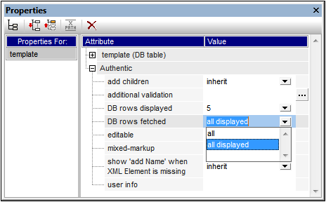 | 4. | For the property DB Rows Fetched, select all or all displayed from the dropdown list, or enter the number of rows to be fetched. The value all displayed is the default. This property determines how many rows are fetched when the DB data is loaded. If the value is less than that of the DB Rows Displayed property, then the value of DB Rows Displayed is used as the value of DB Rows Fetched. The DB Rows Fetched property enables you to reduce the number of rows initially loaded, thus speeding up the loading and display time. Additional rows (records) are loaded and displayed when the row navigation buttons in Authentic View are used. |