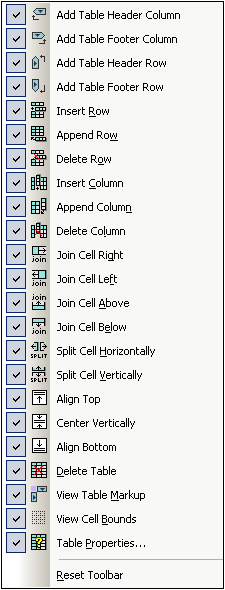 The Table toolbar contains commands to structure and format static and dynamic tables in Design View. These commands are shown in the screenshot below (which is that of the Table toolbar customization menu, available when you click the Customize button at the right of the toolbar).