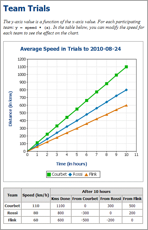 The value line chart examples in this section are located in the (My) Documents folder, C:\Documents and Settings\<username>\My Documents\Altova\StyleVision2026\StyleVisionExamples/Tutorial/Charts. In the first example (see screenshot below), TeamTrials.sps (using TeamTrials.xsd and TeamTrials.xml), the X-Axis show time in hours. The Y-Axis values show distance traveled in time and they are a function of X-Axis values: distance travelled = speed * time.