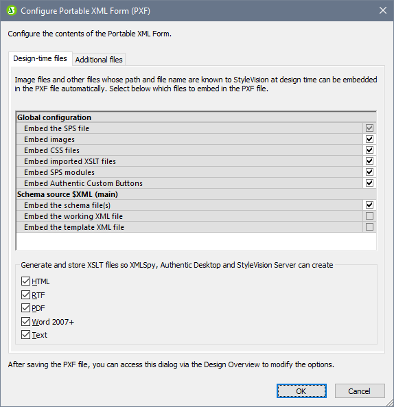 The SPS format is the standard Altova format for StyleVision designs. The PXF format is an Altova format that allows all files related to the design (schema files, XML files, images files, generated XSLT stylesheets, etc) to be embedded with the design. This format is very useful for transporting all the files required to open the design in Authentic View and/or to generate HTML, Text, RTF, PDF and/or Word 2007 output based on the design.