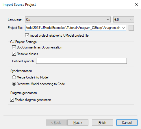 Our goal in this example is to reverse engineer the C# solution and create a UModel project from it. As we import code, we will opt to generate class and package diagrams automatically.