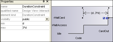 1.Click the DurationConstraint icon, then click the specific position on the lifeline where the constraint is to be displayed. The default minimum and maximum values, "d..t", are automatically supplied. These values can be edited by double clicking the time constraint, or by editing the values in the Properties window.