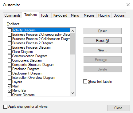1.Click the Reset All button, to reset all the toolbar commands to the state they were when the program was installed. A prompt appears stating that all toolbars and menus will be reset.
