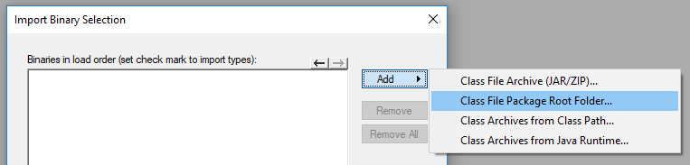 9.In this example, we are importing Java .class files from a package root. Select Add | Class File Package Root Folder. and browse for the C:\UModelDemo\bin directory. If this directory does not exist, make sure to compile the project first, as shown in the first part of this tutorial.