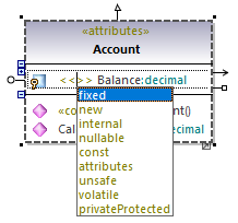 You can also apply stereotypes while designing elements inside a class diagram. To do this, click a property of a class and start typing text inside the "<< and ">>" characters.