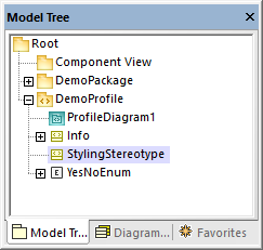 The demo project contains a profile diagram, "ProfileDiagram1". In this diagram, notice that the "DemoProfile" is applied to the "DemoPackage" with a ProfileApplication um_ic_profile_application relationship. This makes the stereotype available to the package, see also Creating and Applying Custom Profiles.