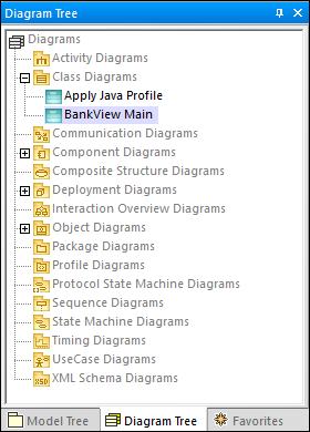 Note:It is also possible to open the diagram from the Model Tree window. First, locate the diagram under the package "Root | Design-phase | BankView | com | altova | bankview", and then use either of the methods above to open it.