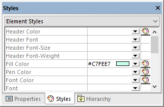 You can change the appearance (style) of modeling elements, including their color, font size, font weight, background color, line thickness, and others. The appearance of elements can be changed at various levels: globally for all elements in the project, selectively for all elements of the same family (for example, classes), or for each individual element. For information about changing the style of the diagram itself, see Changing the Style of Diagrams.