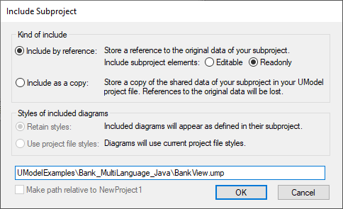 1.Right-click the subproject and select Subproject | Include as Copy. This opens the "Include Subproject" dialog box, which allows you to define the diagrams styles you want to use when including the subproject.