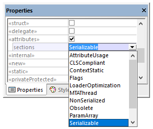 Some stereotypes are associated with a list of name-value pairs referred in UML as "tagged values". To apply a stereotype with tagged values to an element, select the stereotype's check box in the Properties window (in this example, «attributes»). This adds an indented entry where you can select the required value from a predefined list.