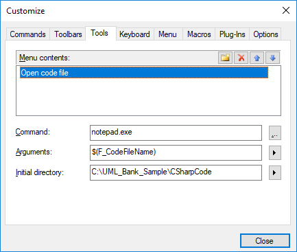 In some cases, you may also need to enter a value in the Initial Directory input box. For example, the configuration below opens in Notepad the code file of the currently selected element on a diagram. (Note that, for this command to work, the element currently selected on the diagram must have a value (file name) defined in the code file name field of the Properties Window, and that file must exist in C:\UML_Bank_Sample\CSharpCode directory).