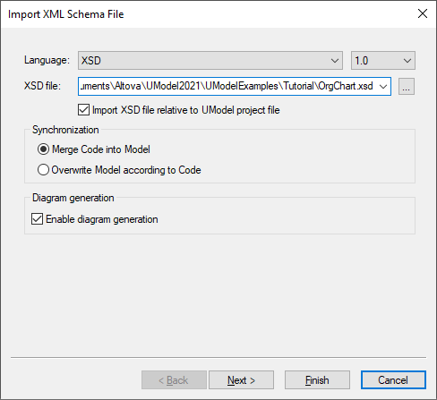 2.Click Browse and select the source schema to import. For the scope of this example, you can use the following schema: C:\Users\<username>\Documents\Altova\UModel2025\UModelExamples\Tutorial\OrgChart.xsd.