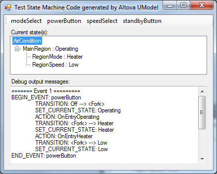 The screenshot above shows the AirCondition State Machine diagram which is available in the ..\StateMachineCodeGeneration directory under ...\UModelExamples. A separate directory exists for each of the code generation languages supported by UModel.