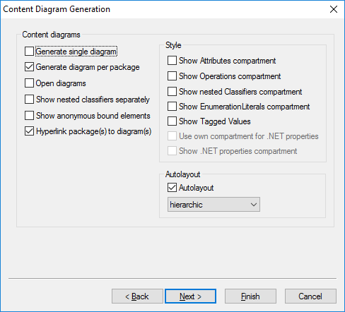 5.Select the Generate diagram per package option. This instructs UModel to create a new diagram for each package. The diagram styling options can be changed later if necessary.