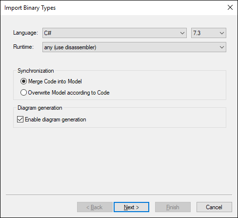 6.Optionally, to generate class diagrams and package diagrams from the imported binary types, select the Enable diagram generation check box. If you select this option, more diagram generation options will be available in the next steps. See Generating Class Diagrams and Generating Package Diagrams.