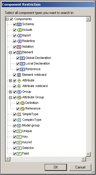 located to the right of the text field (see screenshot above). This pops up the Component Restriction dialog (screenshot below), in which you can select the components to be searched by checking them. Checking the Components item at the top of the list selects all components (text entry: all). Unchecking it de-selects all components (text entry: none)—including individually selected components. Individual components, therefore, can be selected only when the Components item is unchecked. The selected components are entered in the text field as a comma-separated list (see screenshot above).