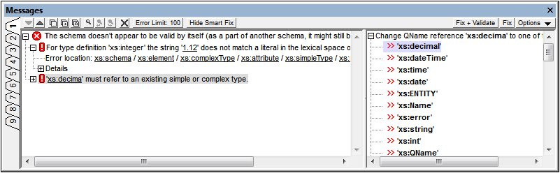If the document is invalid, the Messages window will change to display two panes (see screenshot below). The left-hand pane (the Errors pane) lists the first x errors, or all errors. The right hand pane is the Smart Fix pane; it contains a list of possible fixes for the error selected in the left-hand pane. For example, in the screenshot below, selection of the second error in the Errors pane has caused possible fixes for this error to be listed in the right-hand Smart Fix pane. If you select one of the fixes and then click either Fix+Validate or Fix, the error in the document is corrected with this particular fix.