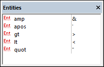 | Note: | The Entities Entry Helper is not context-sensitive. All available entities are displayed no matter where the cursor is positioned. This does not mean that an entity can be inserted at all locations in the document. If you are not sure, then validate the document after inserting the entity: XML | Validate XML (F8). |