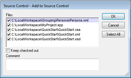 Follow the source control system's instructions to make the connection and configuration. After this has been completed, all the files selected for addition plus the project file (.spp file) are displayed in an Add to Source Control dialog (screenshot below). Select the files you wish to add and click OK.