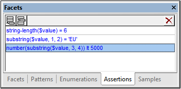 | Note: | It is a good practice recommendation to use other facets in preference to assertions where possible. For example, the restriction specified by the first assertion in the screenshot above would be better specified by the length facet (in the Facets tab). |