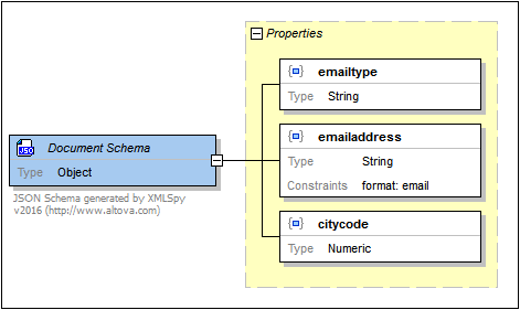 An object can have properties, pattern properties, property wildcards, and property names schemas (new in draft-07). These can be added to the object via the context menus: (i) of the object, (ii) of the yellow properties box (right-click the Properties title of the box), and (iii) of individual properties. Properties have been described above. We now look at pattern properties and property wildcards.