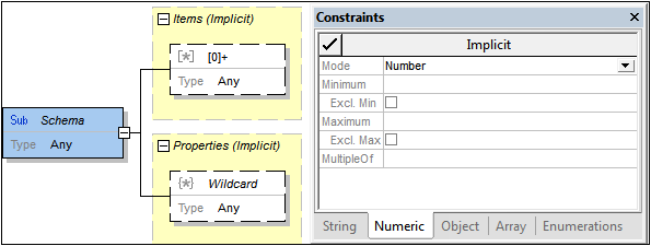In the screenshot above, the sub-schema has a type of Any. So, all JSON types are valid for this definition. The following is implied and is implemented accordingly in the UI: