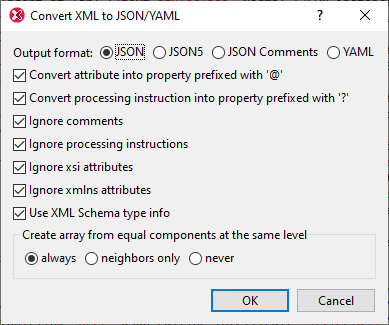 •JSON/YAML object properties are converted to XML elements. The first options in the dialog enable you to chose whether some types of properties are created or not.