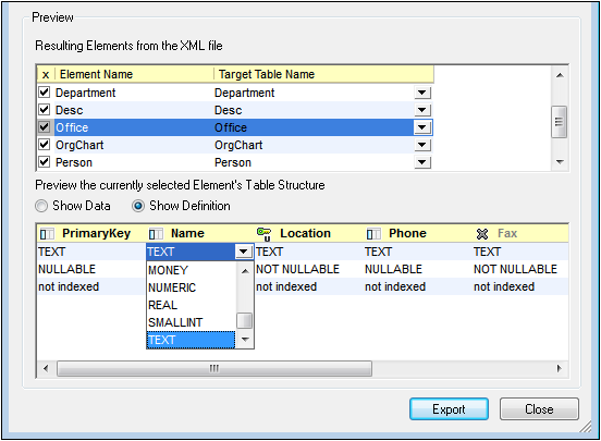 The Resulting Elements from XML File pane shows the name of the nodes in the XML document that will be exported and its corresponding name in the generated file. You can select/deselect nodes that will be exported. When an element is selected, a preview of its structure in the generated file is shown in a second pane below. This preview can be switched between a preview of: (i) data in the generated structure (Show Data); or (ii) definitions of each column in the generated structure (Show Definition). The screenshot above shows the column definitions.