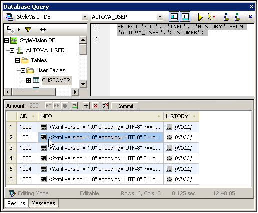 In the Database Query window, when a query is addressed to an XML DB and the query is executed for data editing, the Result Grid at the bottom of the Database Query window provides access to the XML files in the database so these can be edited (see screenshot below).