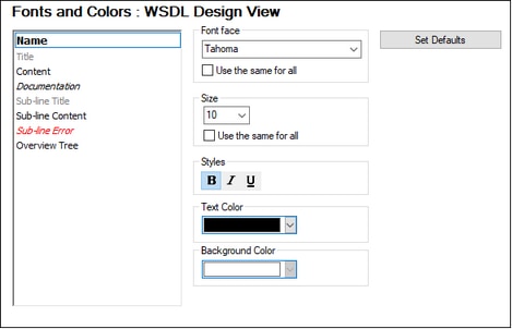 Font face and size: The selected font will also be used in printouts of WSDL Design View. If you want to use the same font face or size for all text item types, check the respective Use the same for all check box.