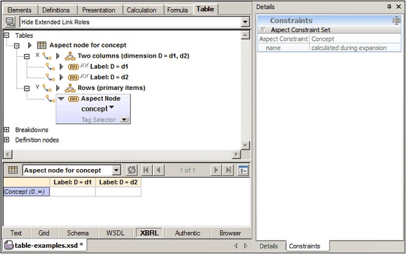 An aspect node is an open definition node which directly specifies a single participating aspect. During the layout process an aspect node expands to a cell for each distinct value of its participating aspect that is present among the facts of an XBRL instance file. Since the aspect value constraint is not fully determined by the node’s definition and the DTS, the layout preview shows a place holder (see screenshot below).
