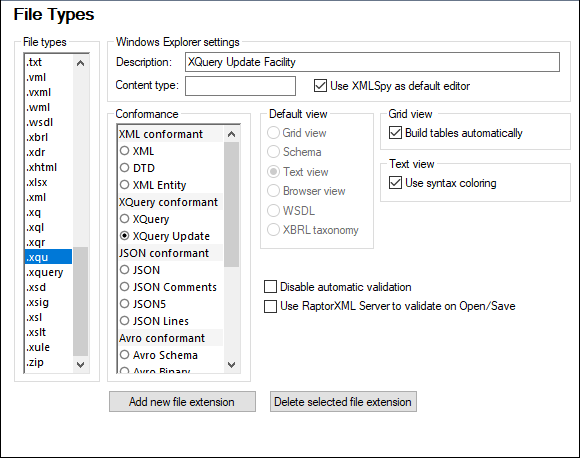 File extensions currently defined as XQuery and XQuery Update in XMLSpy