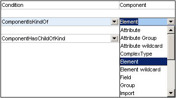 The condition of the Property kind is Property Value (see screenshot below). This kind of condition specifies the nature of a property. It therefore requires entries in the Property and Comparator columns, and, optionally, an entry in the Value column. No entry is required in the Component column, which is therefore grayed out. Properties listed in the dropdown lists of the Property column include not only XML attributes (such as default and maxOccurs) but also the logical properties of components (such as derivedBy).