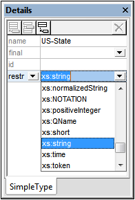4.Press Enter to confirm. The simple type US-State is created and appears in the list of simple types in the Components Entry Helper (Click the expand icon of the simpleType entry to see it).